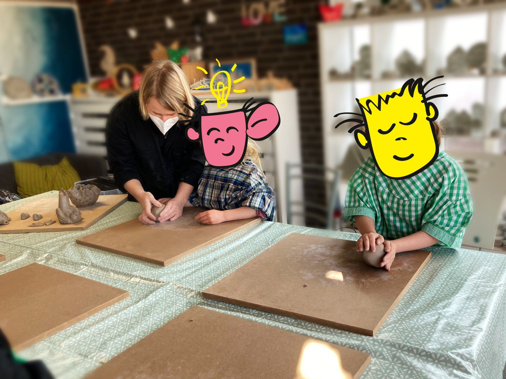 Die kleinen und großen Teilnehmer der Kurse lernen den Umgang mit verschiedenen Techniken und Materialien kennen. Z.B.: